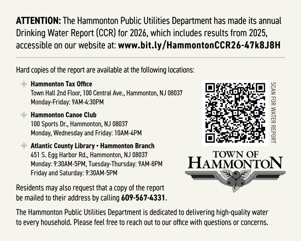 ATTENTION: The Hammonton Public Utilities Department has made its annual Drinking Water Report (CCR) for 2026, which includes results from 2025, accessible on our website at: www.bit.ly/HammontonCCR26-47k8J8H
