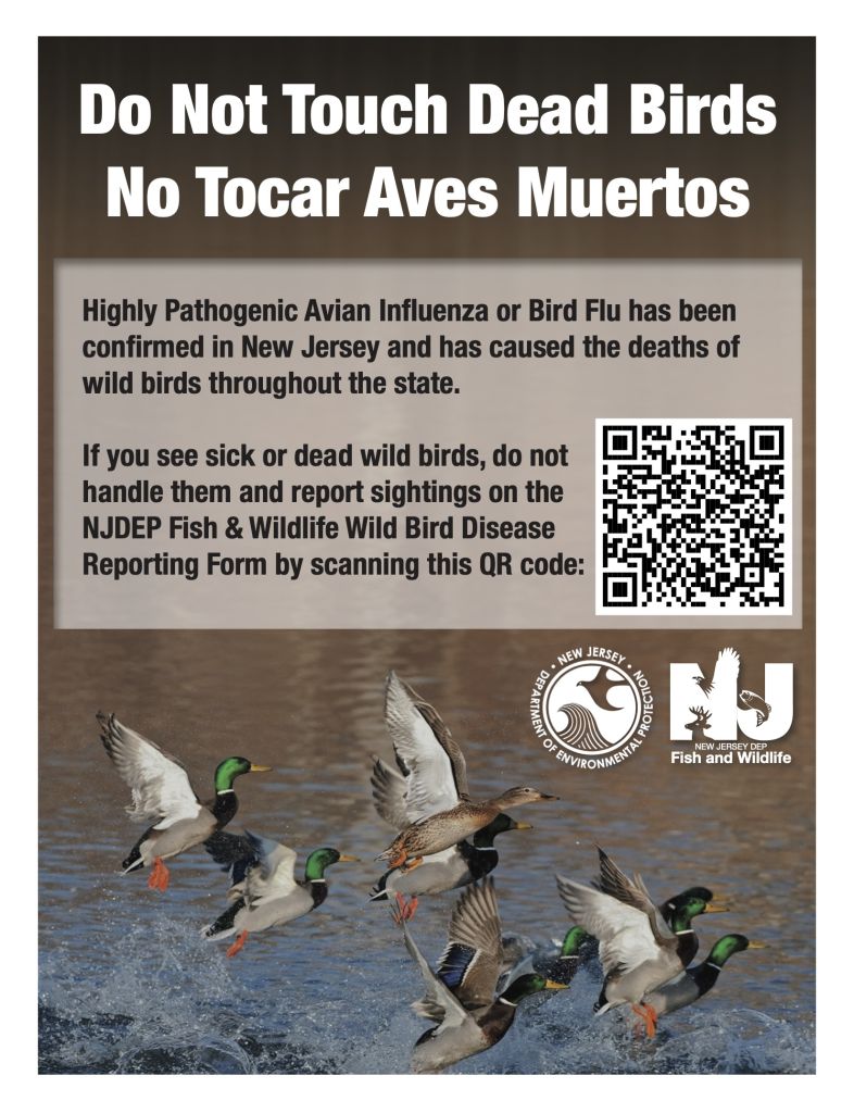 Residents are asked to report sick and dead birds to the New Jersey Department of Environmental Protection (NJDEP) by completing a reporting form available at: https://dep.nj.gov/njfw/highly-pathogenic-avian-influenza/