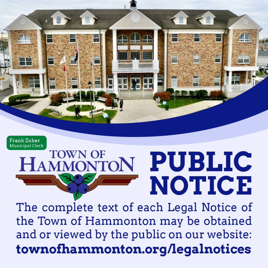 In accordance with P.L. 2025, c.72, the full text of all legal notices pertaining to the Town of Hammonton, including those from the Governing Body, Boards and Commissions, is accessible to the public on our website: https://www.townofhammonton.org/legalnotices/