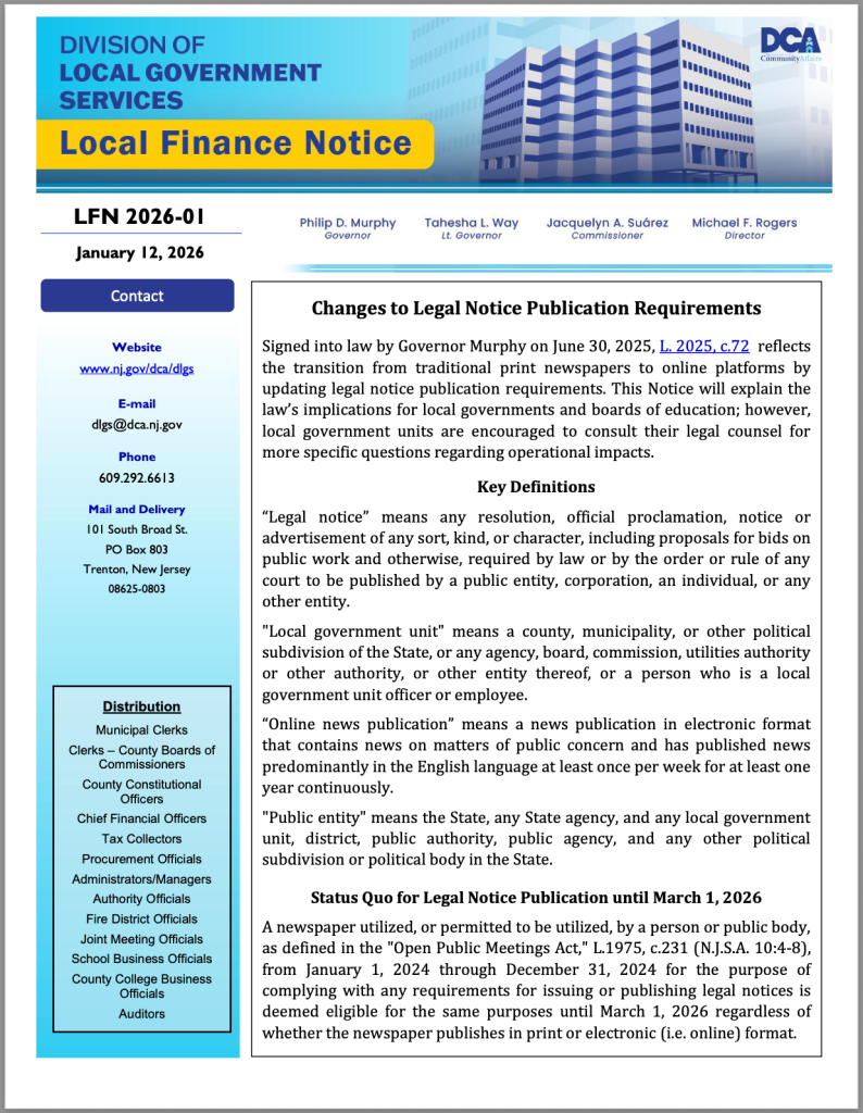 Signed into law on June 30, 2025, P.L. 2025, c.72 reflects the transition from traditional print newspapers to online platforms by updating legal notice publication requirements. The New Jersey Department of Community Affairs notice, which explains the law’s implications, can be downloaded here: https://www.townofhammonton.org/wp-content/uploads/2026/02/Public_Notice_Legislation.pdf