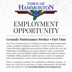 The Town of Hammonton is seeking a part time grounds maintenance worker. Qualified candidates must have a valid N.J. driver’s license. Under direction, applicant must perform routine work in the care and maintenance of outdoor areas such as gardens, parks, recreational areas, lawns, turf and athletic fields including some indoor locations. Candidate will be required to safely operate a variety of equipment, tools, and machinery used to care for and maintain town grounds.