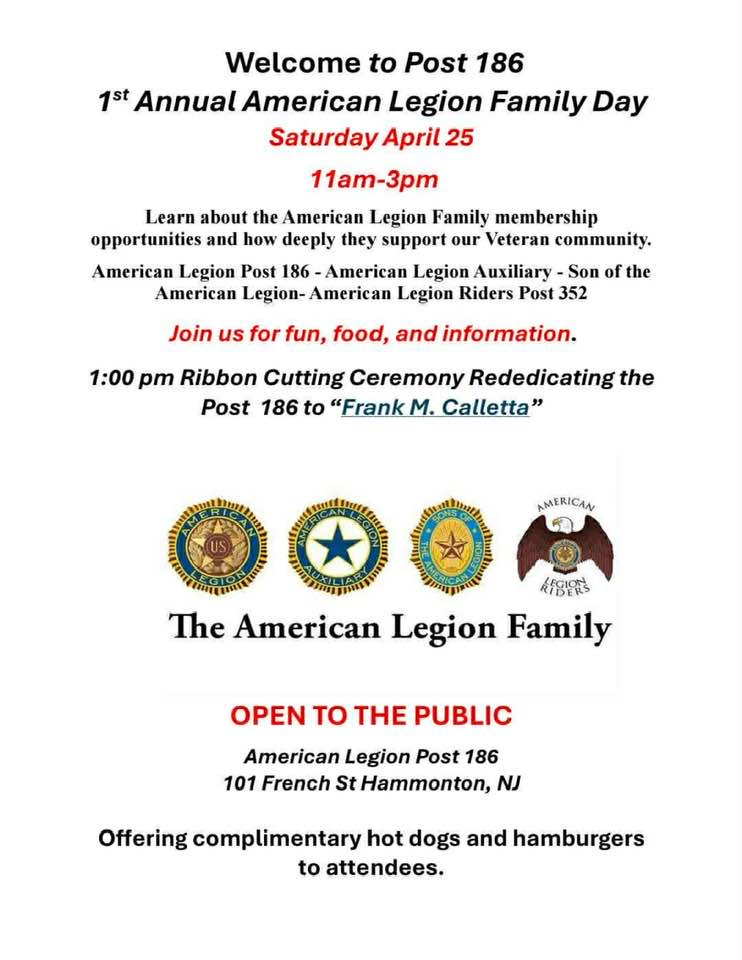 1:00 pm Ribbon Cutting Ceremony Rededicating the Post 186 to “Frank M. Calletta”