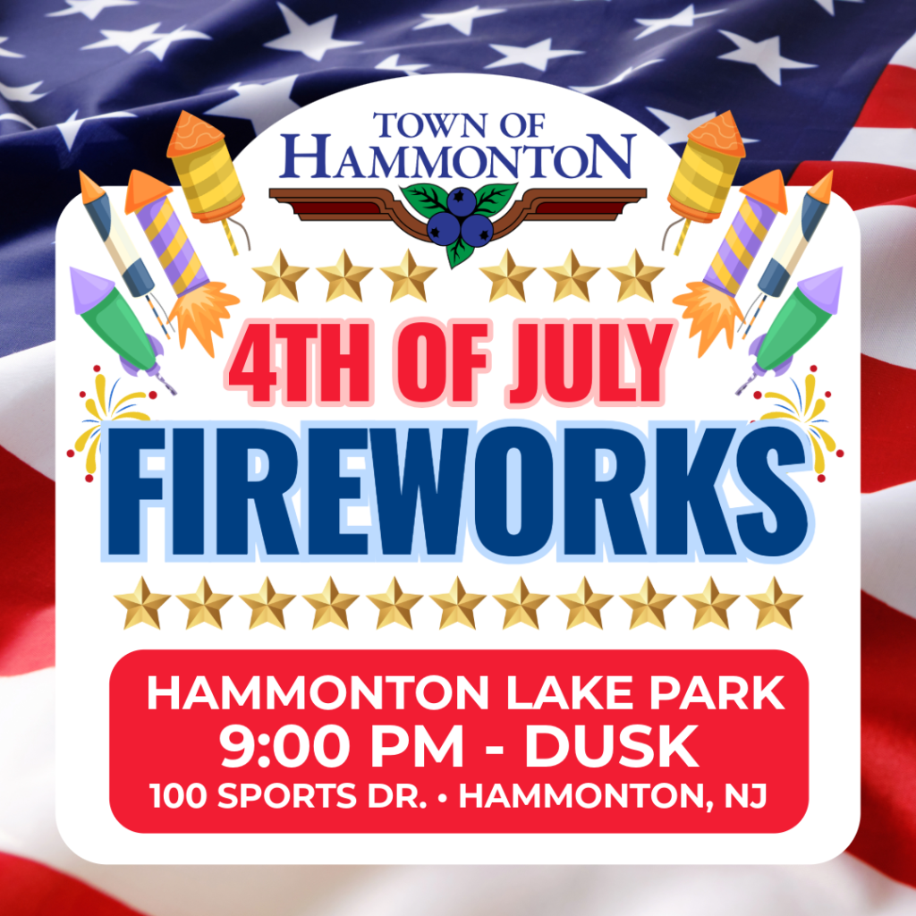 4th of July Fireworks will be held at Hammonton Lake Park, 100 Sports Drive, Hammonton, NJ on Friday, July 4th, 2025 at around dusk, approximately 9:00 p.m. The fireworks will be set off from the little league baseball field along S. Egg Harbor Road, same area as last year, 2024.