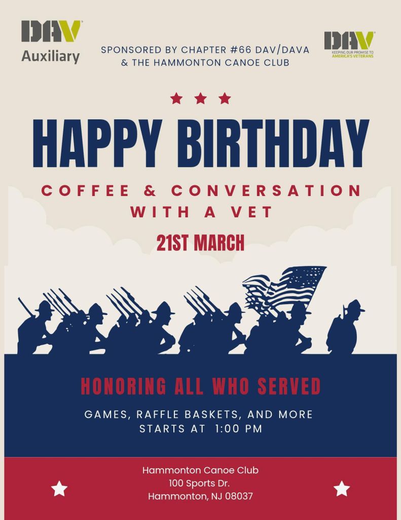 Help us help our Veterans! Please Join us at the Hammonton Canoe Club on Saturday, March 21, 2026 for a special Coffee & Conversation with a Vet event beginning at 1:00 p.m., with games, conversation starters, light refreshments – coffee of course and more. We will also have a CSO available for veterans who need assistance with their claims as well as important veteran resources and information.