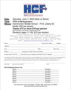 Individuals are $20 each, but teams of 5 or more are $15 each (all participants must have their own individual registration form). See hammontoncancerfoundation.org for the registration form, or you can register at the event the day of.