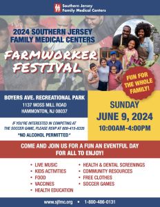 Southern Jersey Family Medical Centers Farmworker Festival: Sunday, June 9 from 10 a.m. to 4 p.m. at Moss Mill Park, 1137 Moss Mill Rd., Hammonton, N.J.