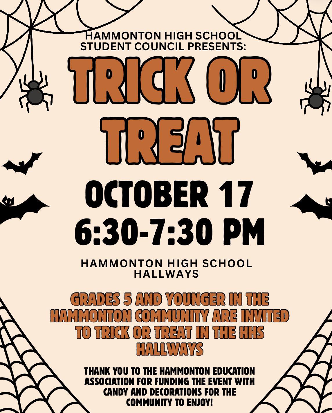 The Hammonton High School Student Council is hosting a Community Trick-or-Treat Night on Friday, October 17, from 6:30–7:30 pm at Hammonton High School.