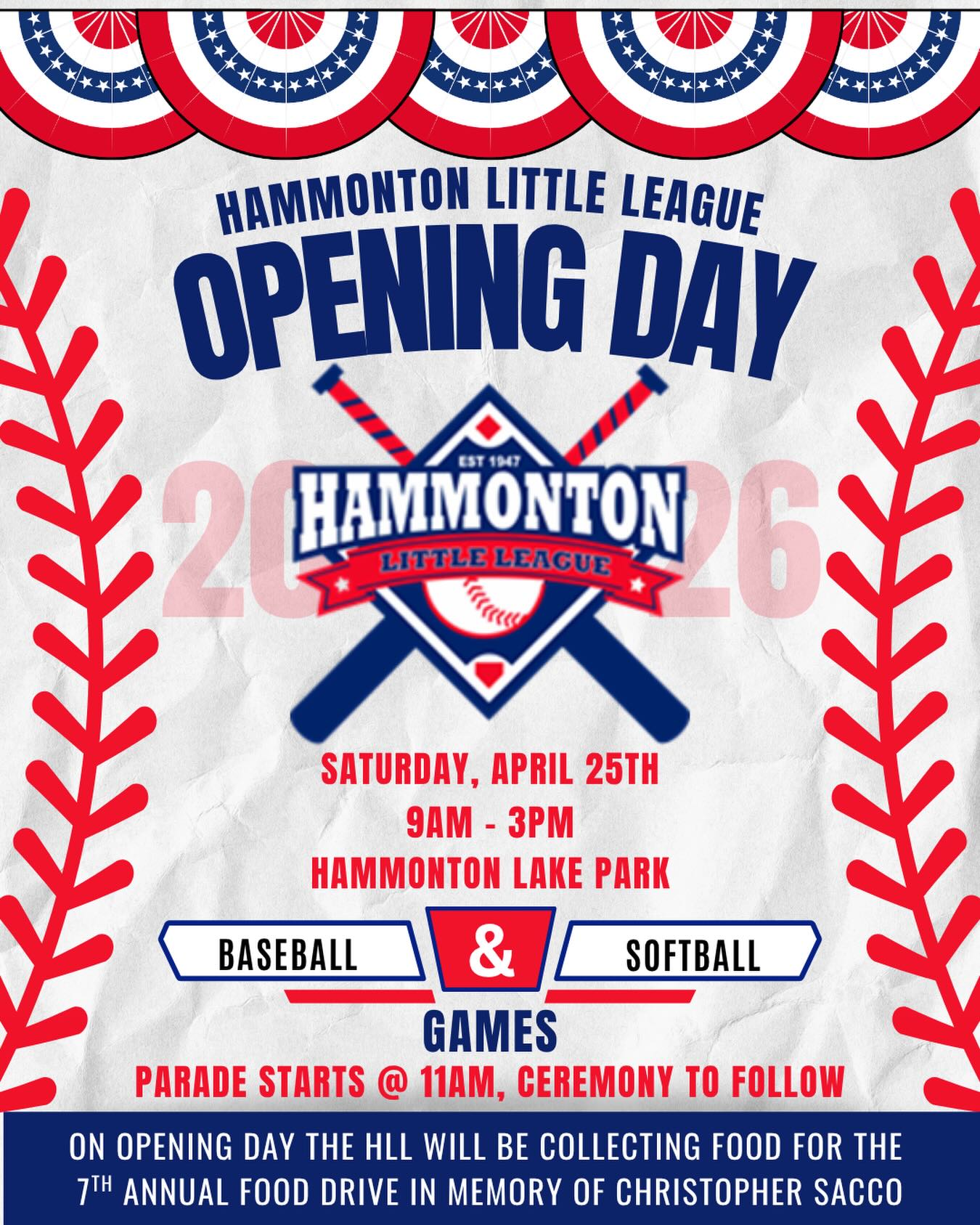 We will also be collecting donations for the 7th Annual Food Drive in Memory of Christopher Sacco, a former Hammonton Little Leaguer and our Angel in the Outfield. Any non-perishable donations are greatly appreciated.
