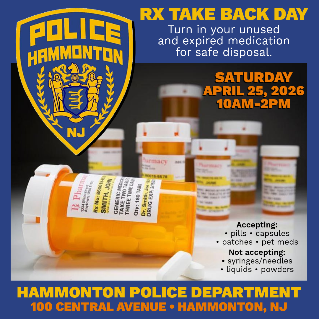 The Hammonton Police Department will be hosting a Prescription Drug Take Back Day on Saturday, April 25th, 2026 from 10 a.m to 2 p.m.