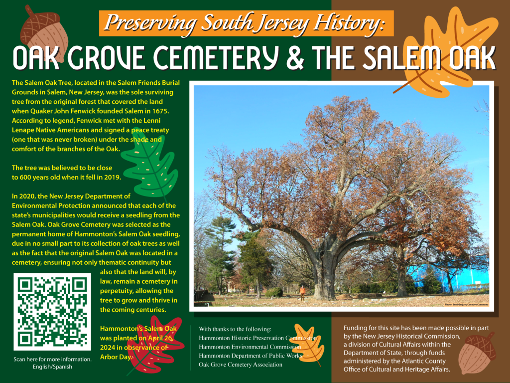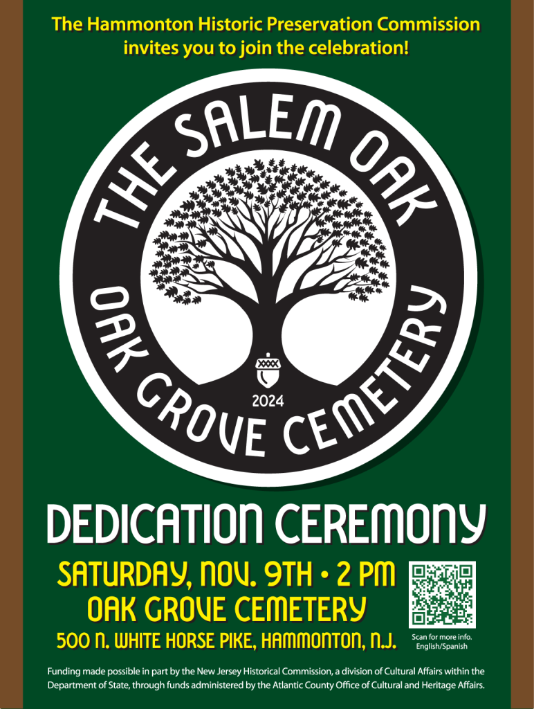 The Hammonton Historic Preservation Commission (HHPC) is delighted to invite you to the Dedication Ceremony of the Salem Oak Seedling, recently planted in the historic Oak Grove Cemetery at 500 N White Horse Pike, Hammonton, New Jersey. The Dedication Ceremony will be held at the cemetery on November 9, 2024 at 2:00 PM.