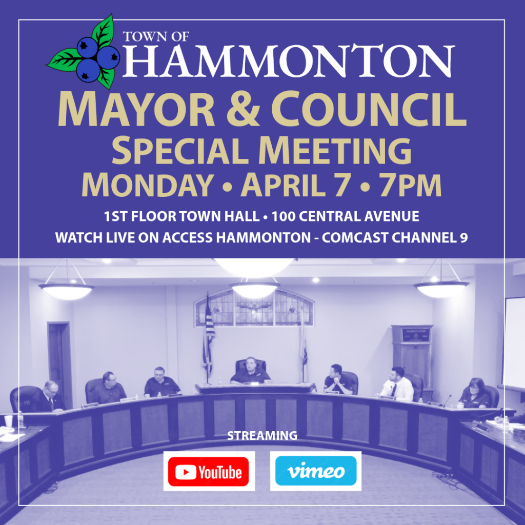 The Mayor and Council of the Town of Hammonton will hold a special meeting to discuss the 4th Street water tower on Monday, April 7th at 7:00 p.m. Official action may be taken. Additional items may be discussed and acted upon as deemed necessary.