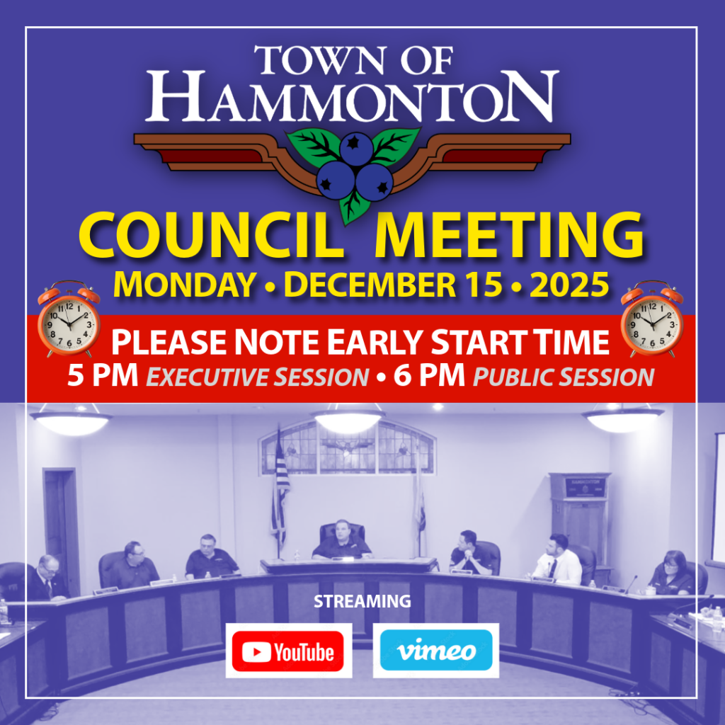 PLEASE NOTE: The public session of the Town Council meeting on Monday, December 15th, 2025 will start one hour earlier than usual, at 6:00 p.m.
