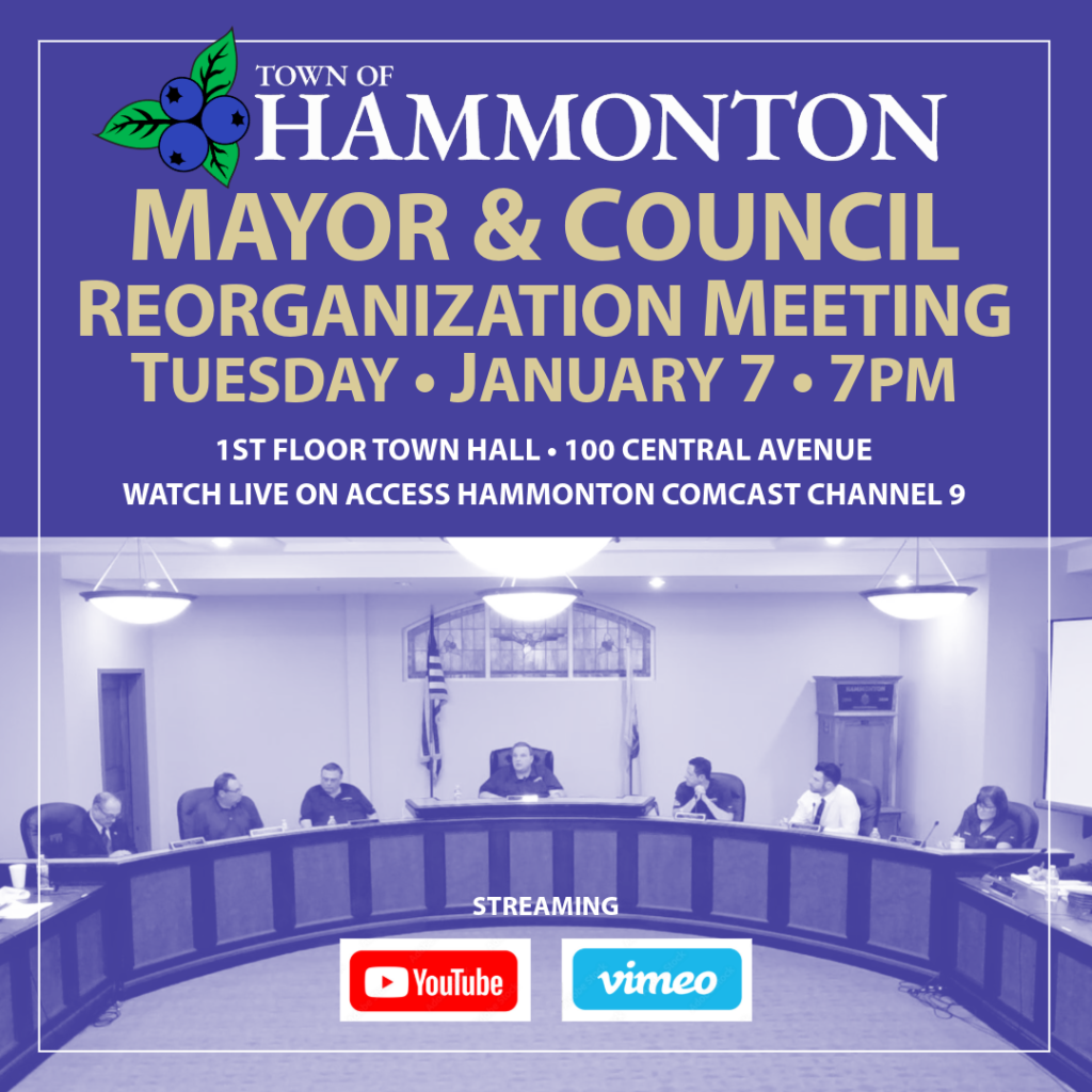 The Reorganization Meeting of Mayor and Council will be held on Tuesday, Jan. 7th, 2025 at 7:00 p.m. Watch live on Access Hammonton on Comcast channel 9. Links to our streaming channels and the meeting agenda are below.