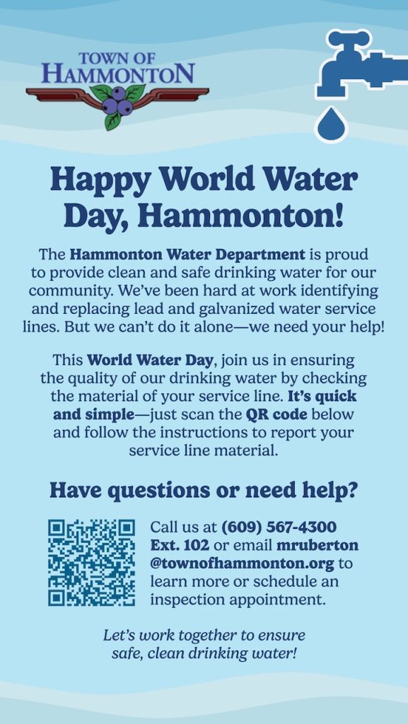 The Hammonton Water Department is proud to provide clean and safe drinking water for our community. We’ve been hard at work identifying and replacing lead and galvanized water service lines. But we can’t do it alone—we need your help!