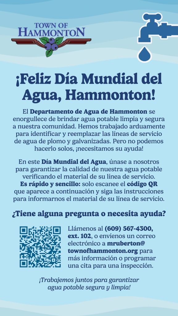 El Departamento de Agua de Hammonton se enorgullece de brindar agua potable limpia y segura a nuestra comunidad. Hemos trabajado arduamente para identificar y reemplazar las líneas de servicio de agua de plomo y galvanizadas. Pero no podemos hacerlo solos, ¡necesitamos su ayuda!