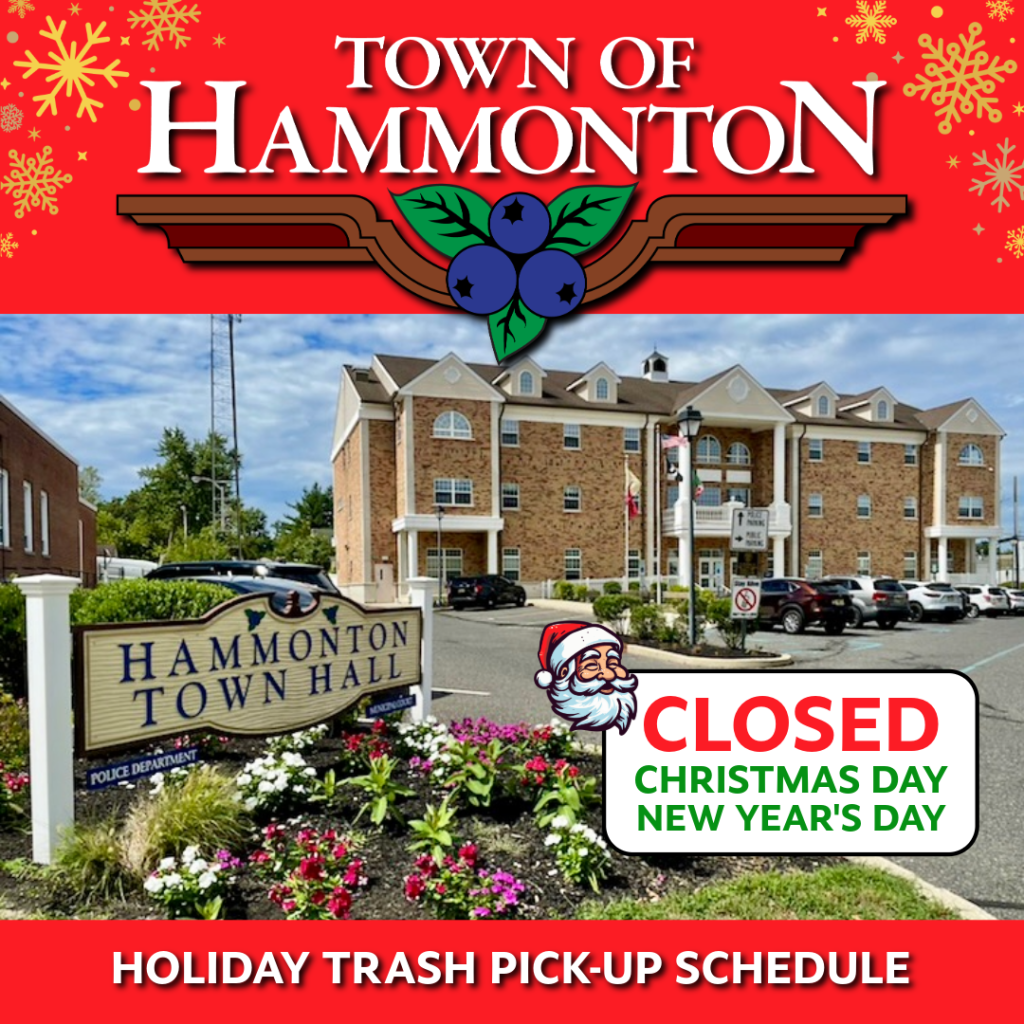 PSA: There will be no recycling or trash collection on Christmas Day, Thursday, Dec. 25, 2025 or New Year’s Day, Thursday, Jan. 1, 2026. All collections will be delayed by one day. Bulk trash collection week is Jan. 5-9, 2026. Town Hall will be closed on Christmas and New Year’s Day. Happy holidays from the Town of Hammonton!