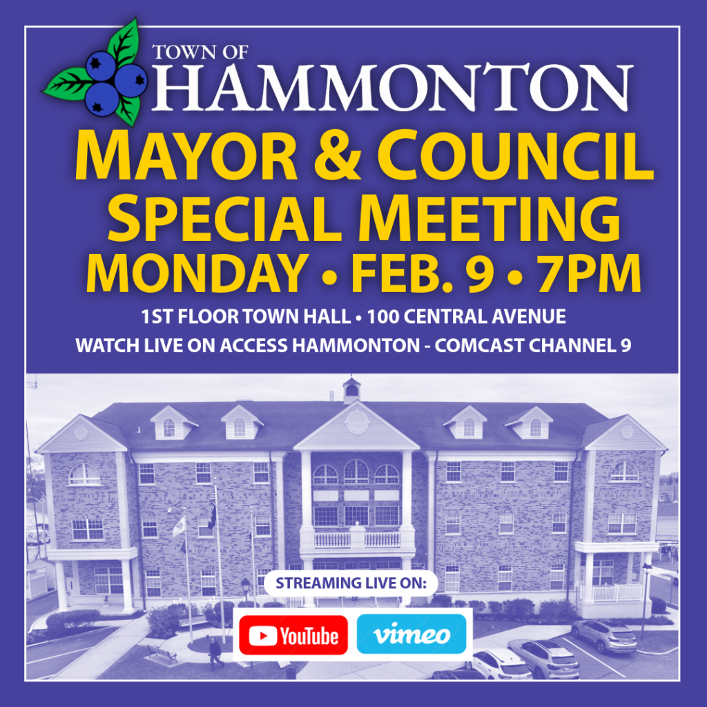 A Special Meeting of Mayor and Council will be held on Monday, Feb. 9 to discuss the 2026 Municipal Budget. The meeting will take place at Hammonton Town Hall beginning at 7:00 p.m. Additional items may be discussed as deemed necessary and official action may or may not be taken during the meeting.