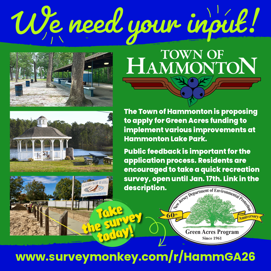 The Town of Hammonton is proposing to apply for Green Acres funding to implement various improvements at Hammonton Lake Park in compliance with NJ Department of Environmental Protection Rules. Public feedback is an important component of the application process.