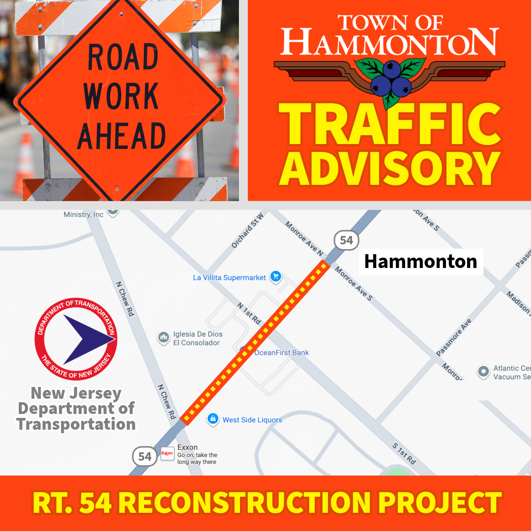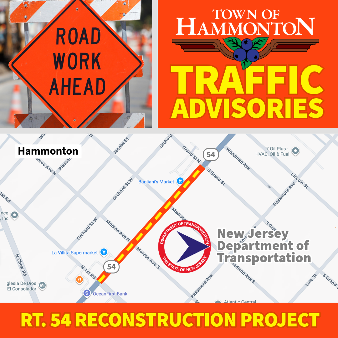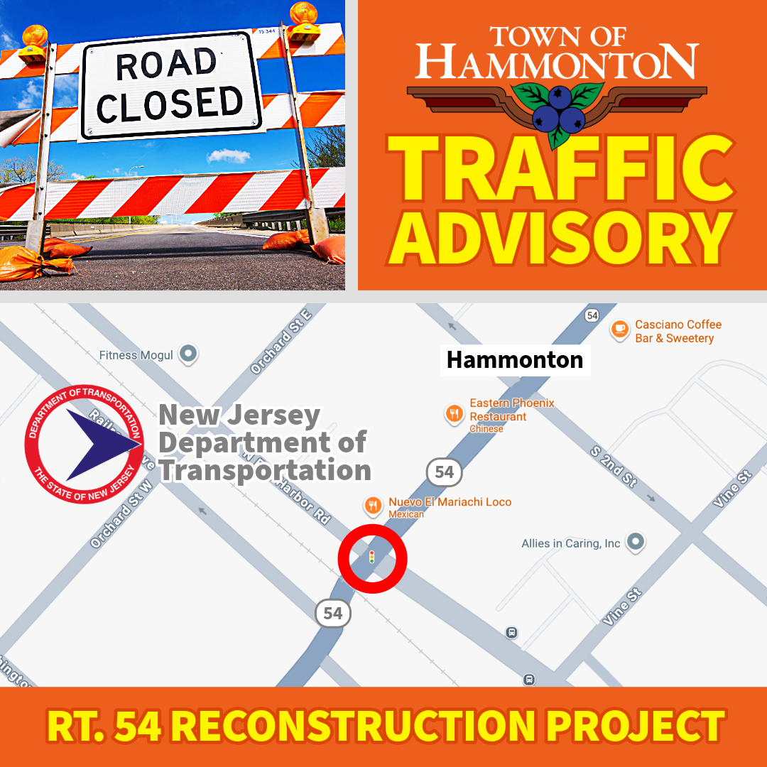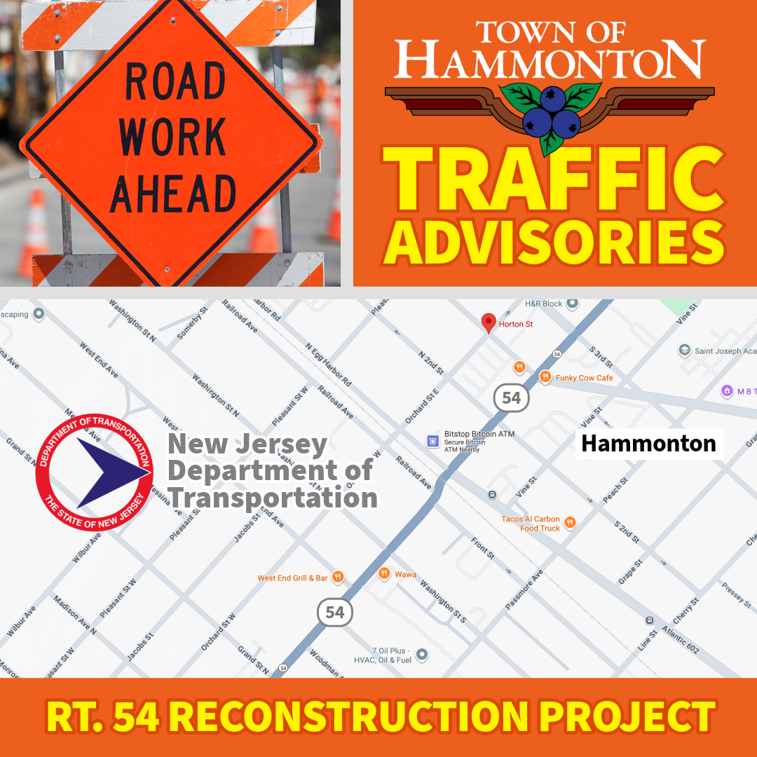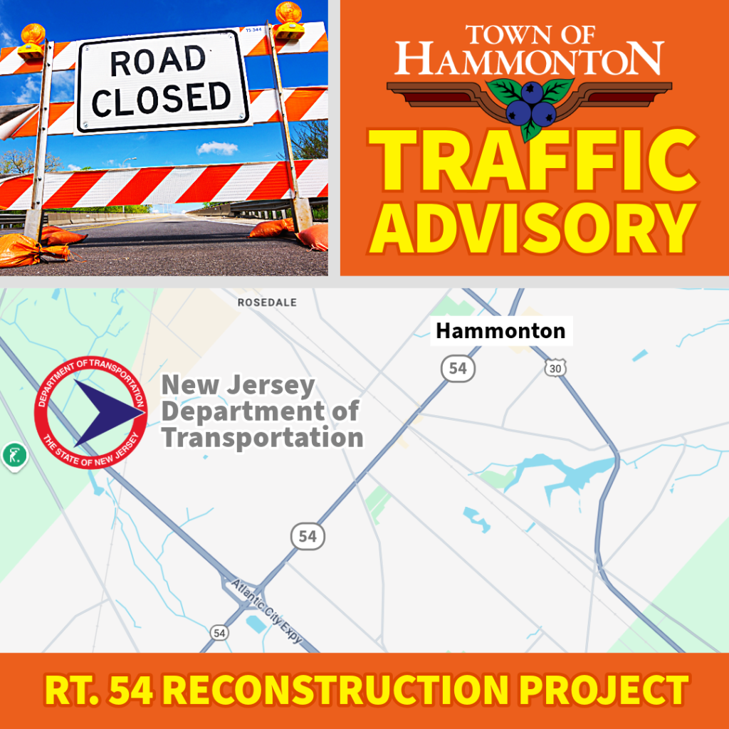The Town of Hammonton will be committed to informing the public with updates as more information is provided by the N.J. Department of Transportation. Detailed traffic advisories will be posted on all of our social media platforms, Access Hammonton – Comcast channel 9 and on our website townofhammonton.org/route-54.