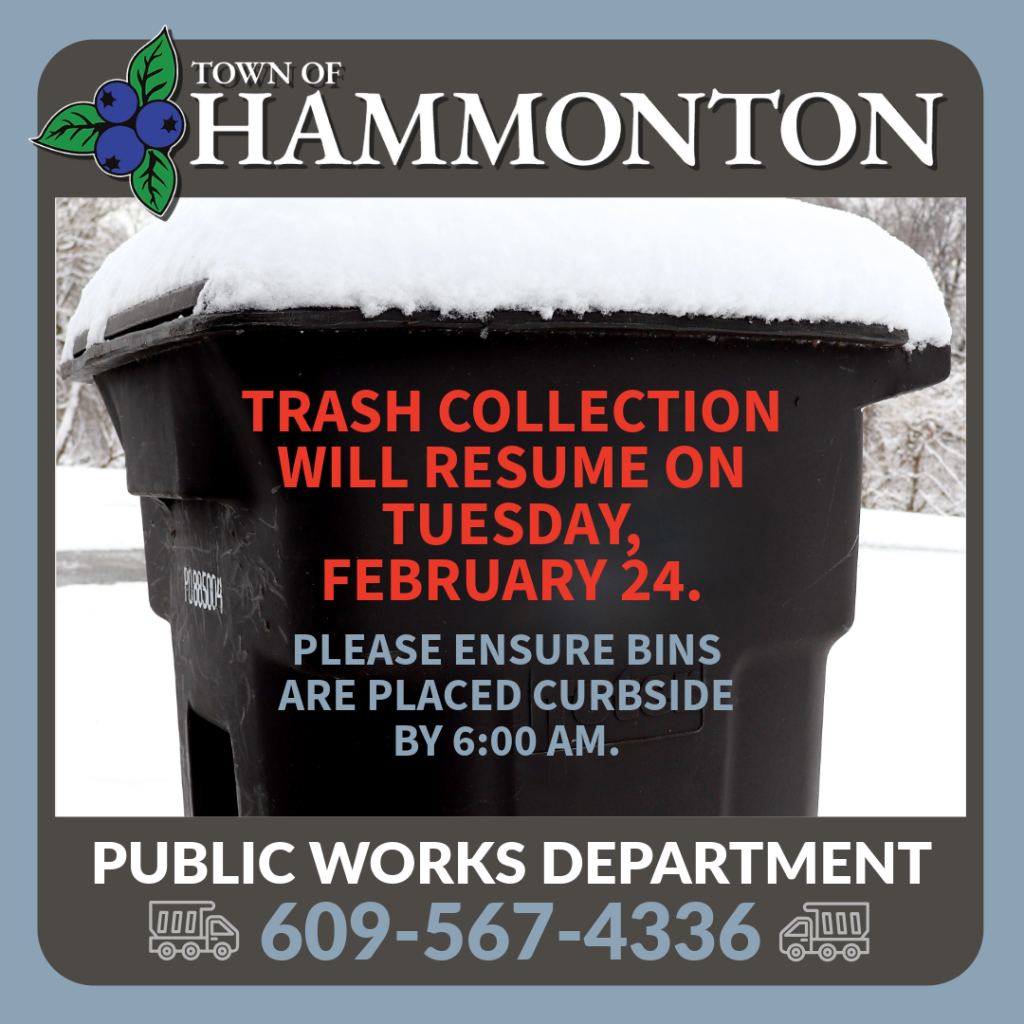 UPDATE: Due to the severe weather experienced on Monday, some areas may face delays throughout the week. We appreciate your patience as the Public Works Department works diligently to keep Hammonton moving safely. Thank you for your understanding and cooperation.