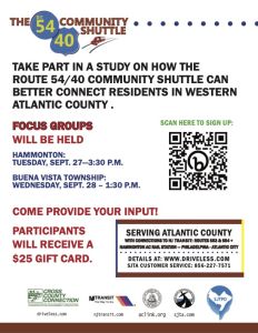 The Rt.54/40 Community Shuttle is hosting a focus group in Hammonton on Tuesday 9/27 dmazzeo2022-09-23T09:13:05-04:00 Share This Event! FacebookXLinkedInWhatsAppPinterestEmail