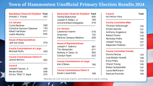 Town of Hammonton Unofficial Primary Election Results 2024 Unofficial results from the June 4, 2024, primary election in Hammonton. Adam Monacelli2024-06-05T15:25:06-04:00 Share This Event! FacebookXLinkedInWhatsAppPinterestEmail