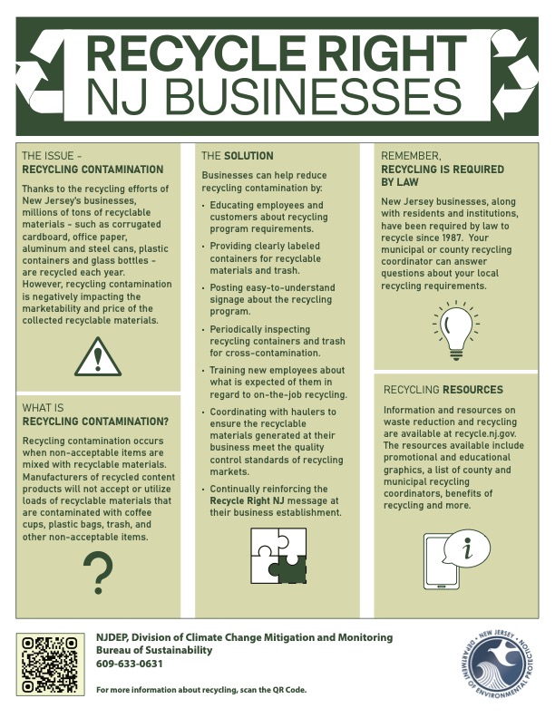 New Jersey businesses, along with residents and institutions, have been required by law to recycle since 1987. Your municipal or county recycling coordinator can answer questions about your local recycling requirements.