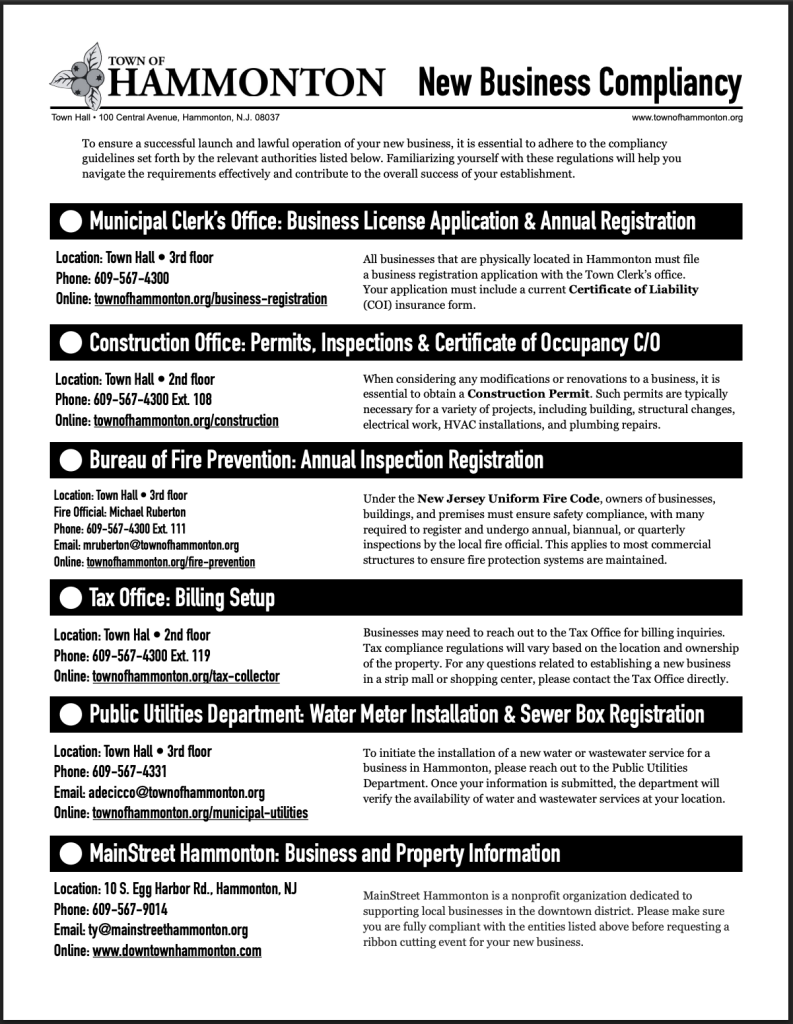 For new businesses located outside the downtown shopping district, such as the White Horse Pike or parts of 12th Street, contact the Municipal Clerk’s office at 609-567-4300 or email amonacelli@townofhammonton.org for assistance.