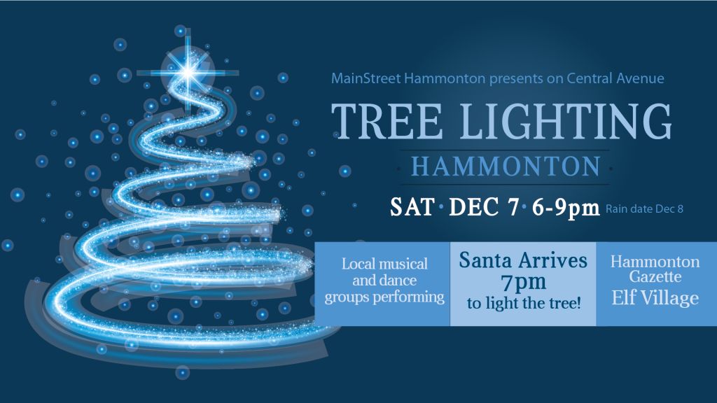 Start the holiday season with us in Downtown Hammonton. Local musical and dance groups will perform. Santa arrives at 7pm to light the tree.