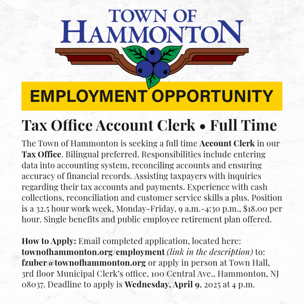The Town of Hammonton is seeking a full time Account Clerk in our Tax Office. Bilingual preferred. Responsibilities include entering data into accounting system, reconciling accounts and ensuring accuracy of financial records. Assisting taxpayers with inquiries regarding their tax accounts and payments. Experience with cash collections, reconciliation and strong customer service skills a plus. Position is a 32.5 hour work week, Monday through Friday from 9 a.m. to 4:30 p.m., $18.00 per hour. Single benefits and public employee retirement plan offered.