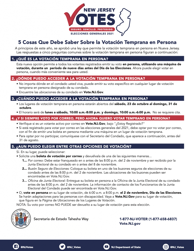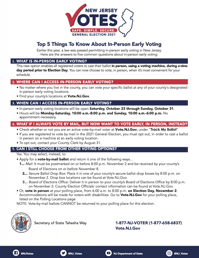 Early In-Person Voting for the 2021 Election will be available for Hammonton Residents from October 23rd to October 31st at the Hammonton Family Success Center located at 310 Bellevue Avenue, Hammonton, NJ 08037. For more information call 609-567-4300 ext.105