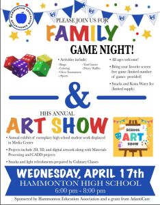 Save the date and join us for a great event on Wednesday, April 17: Family Game Night and the HHS Art Show!