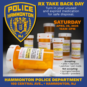 The Hammonton Police Department will be hosting a Rx Take Back Day on Saturday, April 26th, 2025 from 10 a.m to 2 p.m.