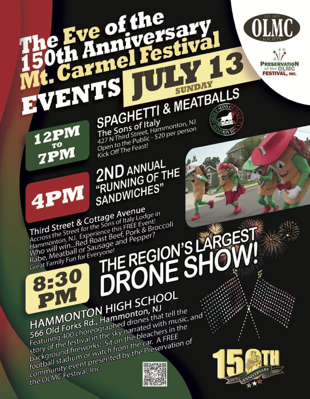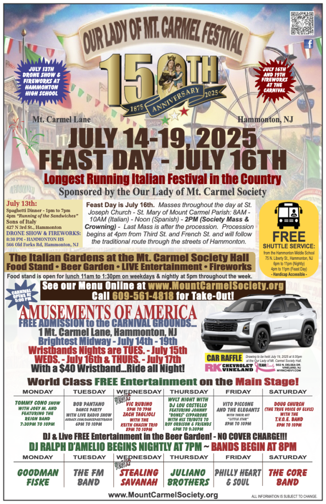 Feast Day is July 16th. Masses throughout the day at St. Joseph Church – St. Mary of Mount Carmel Parish: 8AM – 10AM (Italian) – Noon (Spanish) – 2PM (Society Mass & Crowning) – Last Mass is after the procession. Procession begins at 4pm from Third St. and French St. and will follow the traditional route through the streets of Hammonton.