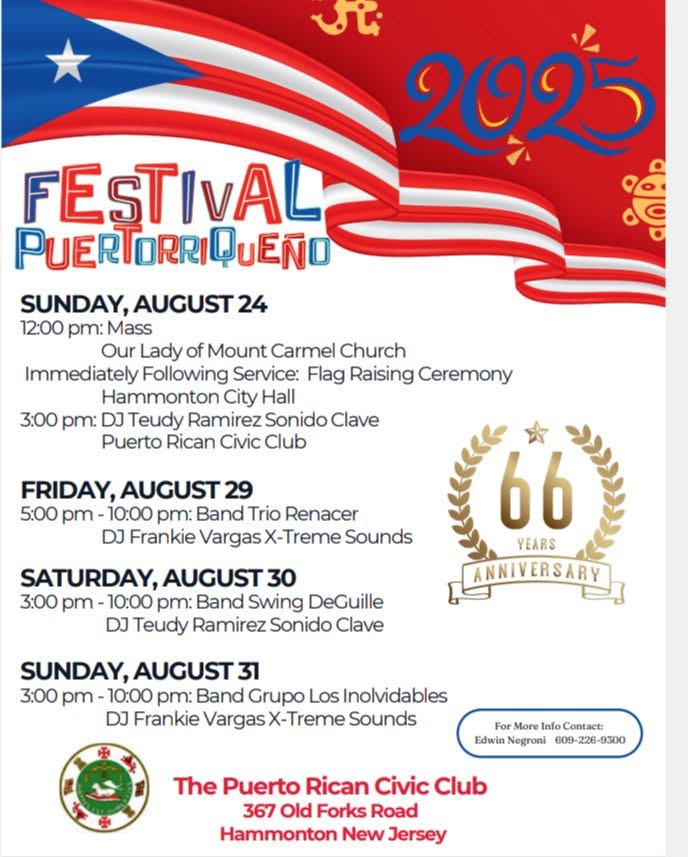 3:00 pm: DJ Teudy Ramirez Sonido Clave at the Puerto Rican Civic Club located at 367 Old Forks Road, Hammonton NJ.
