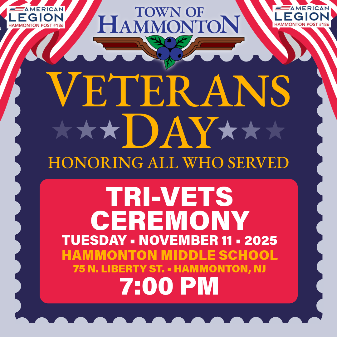 The Tr-Vets of Hammonton will host a Veterans Day Ceremony on Tuesday evening, November 11 (Veterans Day) at 7 p.m. The ceremony will be held in the Hammonton Middle School auditorium on Liberty Street.