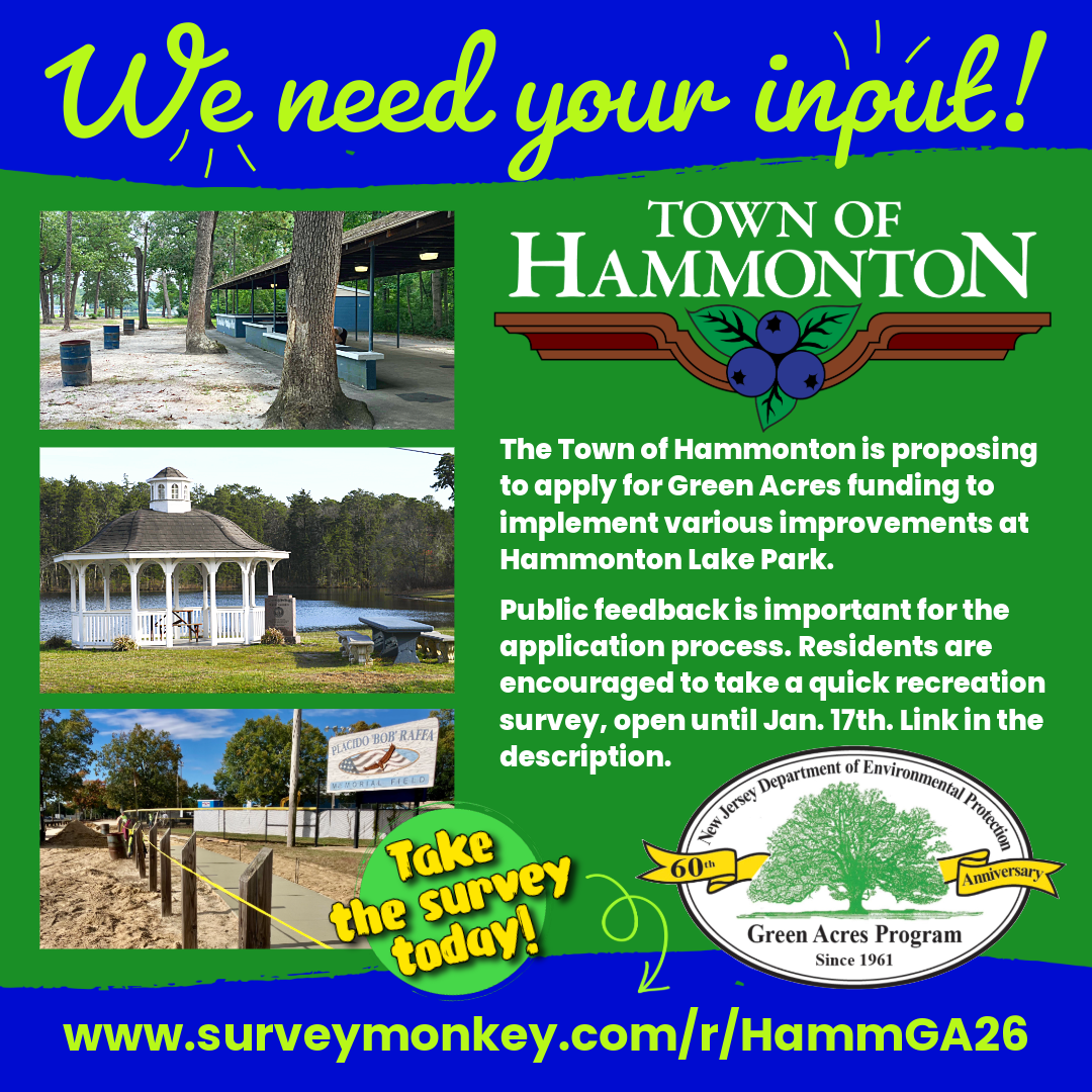 The Town of Hammonton is proposing to apply for Green Acres funding to make various improvements to Lake Park in compliance with NJ Department of Community Affairs rules. Public feedback is an important component of the application process.