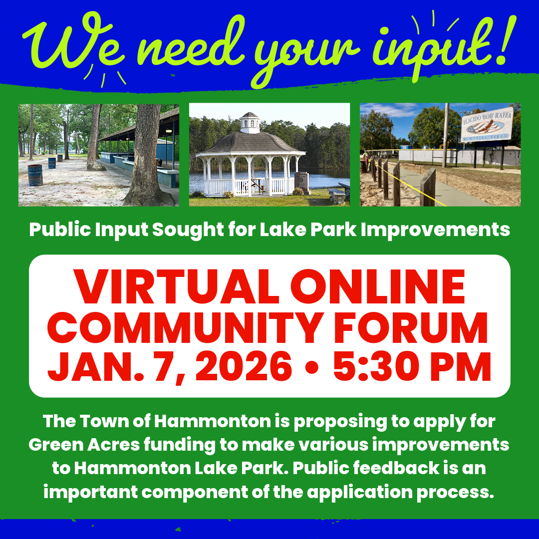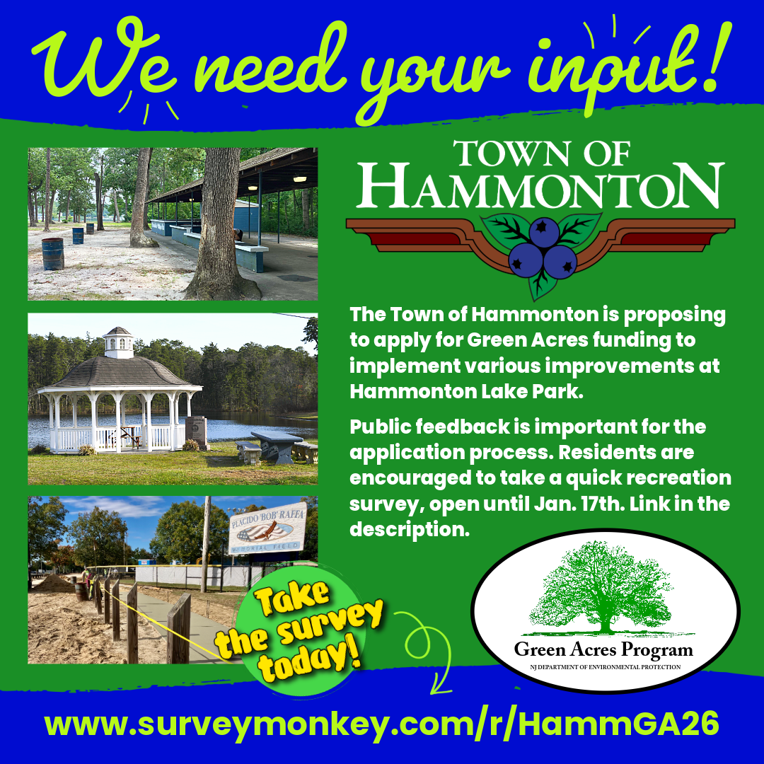 The Town of Hammonton needs your input! We are planning to apply to the New Jersey Department of Environmental Protection’s Green Acres program. Since 1961, Green Acres has protected well over a million and a half acres of open space and provided hundreds of outdoor recreational facilities in communities around the State. This year, the Town of Hammonton is proposing to apply for Green Acres funding to implement various improvements at Hammonton Lake Park in compliance with NJ Department of Environmental Protection Rules. Prior to completing the application process, citizens are requested to provide their comments about the proposed project and offer comments regarding recreation preferences in the Town.
