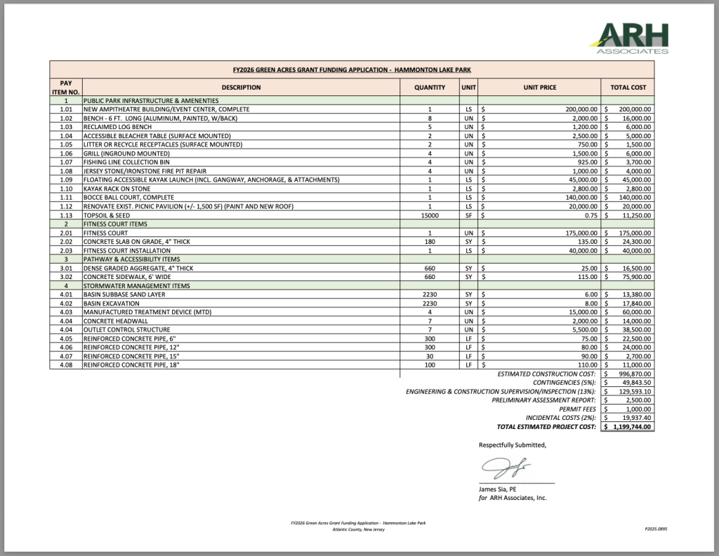 PURPOSE: The Town of Hammonton is seeking funding through the State of NJ Green Acres Program for improvements at Hammonton Lake Park located at 100 Sports Dr. in Hammonton, New Jersey 08037.