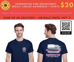Don’t miss out! T-shirts are only available online, now until October 3rd. Shipping is available. Questions? Email Lt. Lizza at hammontonfire2@gmail.com