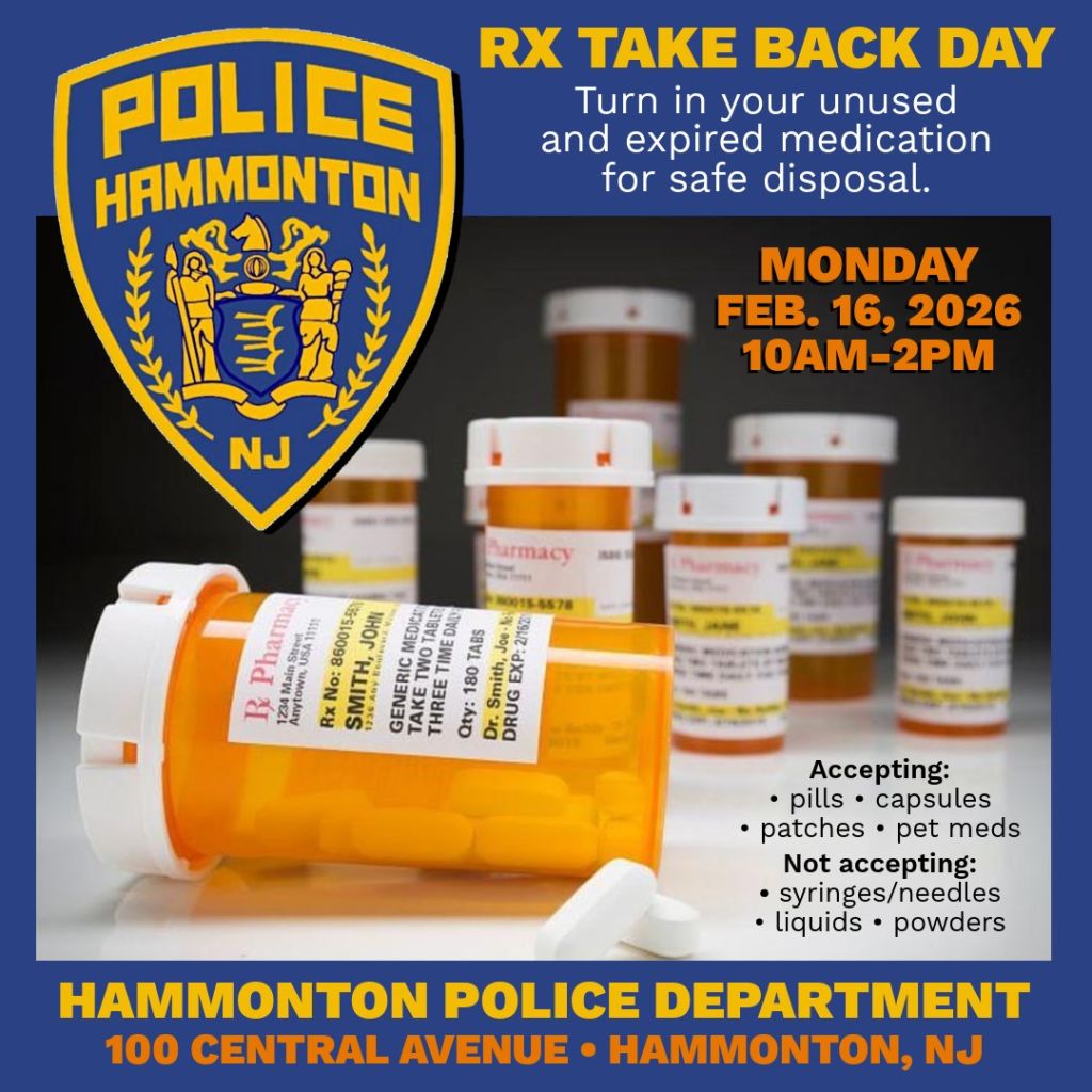 The Hammonton Police Department will be hosting a Rx Take Back Day on Monday, Feb. 16th, 2026 from 10 a.m to 2 p.m.
