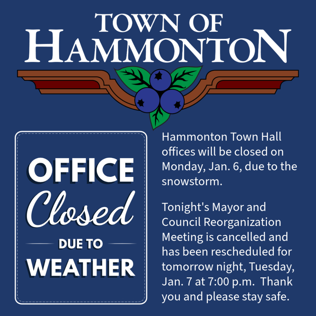 Hammonton Town Hall offices will be closed on Monday, Jan. 6, due to the snowstorm. Tonight’s Mayor and Council Reorganization Meeting is cancelled and has been rescheduled for tomorrow night, Tuesday, Jan. 7 at 7:00 p.m. Thank you and please stay safe.