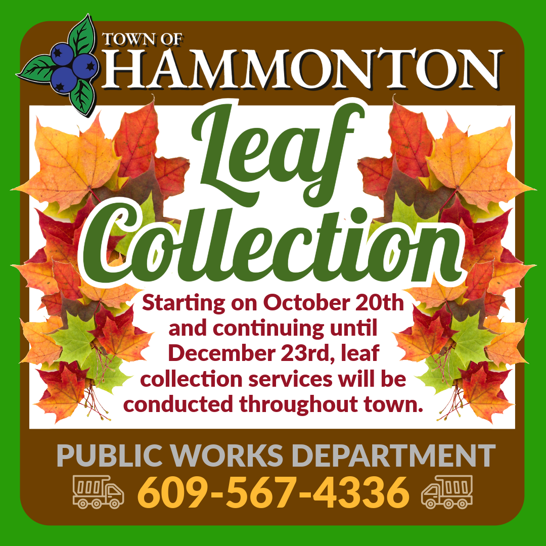 Leaf collection in the Town of Hammonton will commence on October 20th and continue until December 23rd, 2025. Collections are typically scheduled around your regular trash pick-up day; however, please be aware that inclement weather and holidays may cause delays. The Public Works Department appreciates your patience during this time.