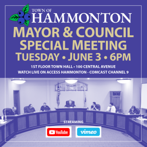 The Mayor and Council of the Town of Hammonton will hold a Special Meeting to discuss grant funded Hammonton Lake Park ADA-compliant upgrades and improvements on Tuesday, June 3rd, 2025. Additional topics may be discussed. Meeting will take place at Town Hall beginning at 6 p.m.