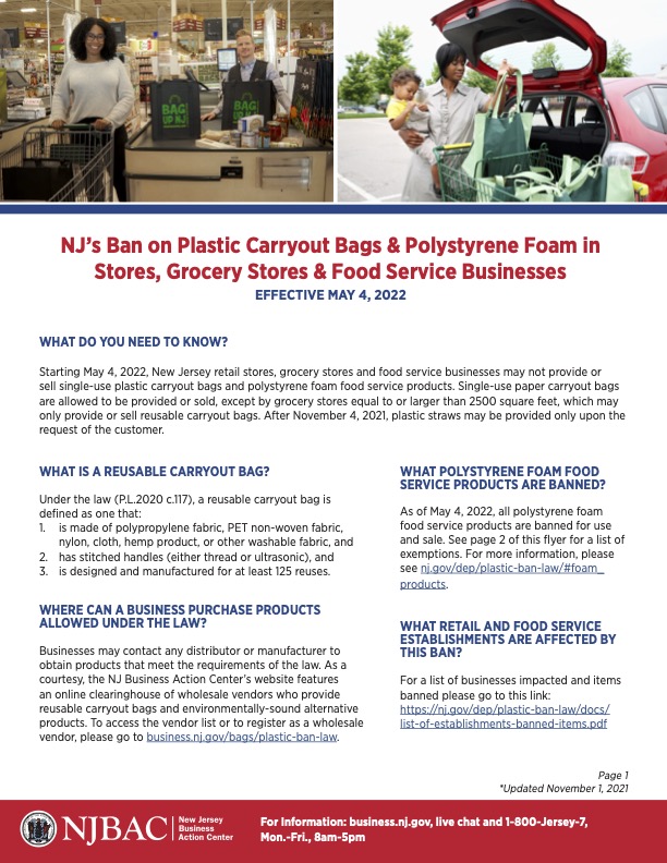 Starting May 4, 2022, New Jersey retail stores, grocery stores and food service businesses may not provide or sell single-use plastic carryout bags and polystyrene foam food service products. Single-use paper carryout bags are allowed to be provided or sold, except by grocery stores equal to or larger than 2500 square feet, which may only provide or sell reusable carryout bags. After November 4, 2021, plastic straws may be provided only upon the request of the customer.