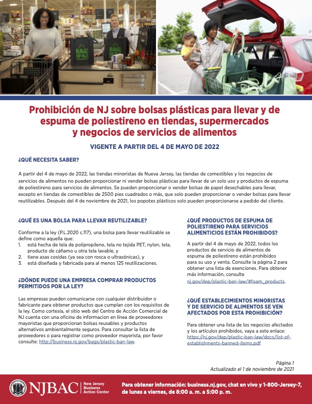 A partir del 4 de mayo de 2022, las tiendas minoristas de Nueva Jersey, las tiendas de comestibles y los negocios de servicios de alimentos no pueden proporcionar ni vender bolsas plásticas para llevar de un solo uso y productos de espuma de poliestireno para servicios de alimentos. Se pueden proporcionar o vender bolsas de papel desechables para llevar, excepto en tiendas de comestibles de 2500 pies cuadrados o más, que solo pueden proporcionar o vender bolsas para llevar reutilizables. Después del 4 de noviembre de 2021, los popotes plásticos solo pueden proporcionarse a pedido del cliente.