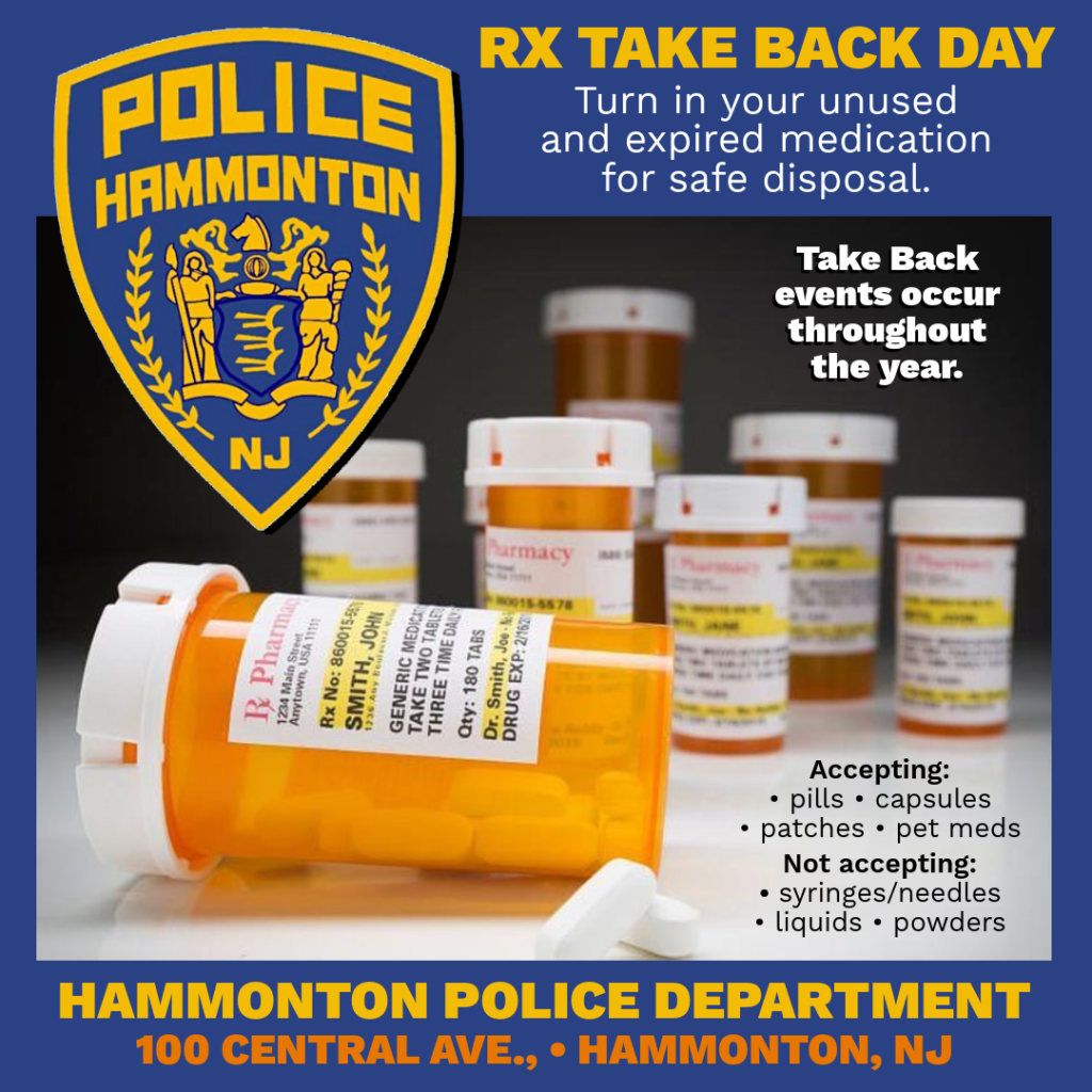 The Hammonton Police Department has been actively involved in medication collection efforts for many years. However, the drug collection box located in our lobby was misused, leading to a potentially dangerous situations. As a result, we have decided to suspend the program. Instead, we will be organizing specific dates for residents to bring in their unused, unwanted and expired medications for safe disposal.