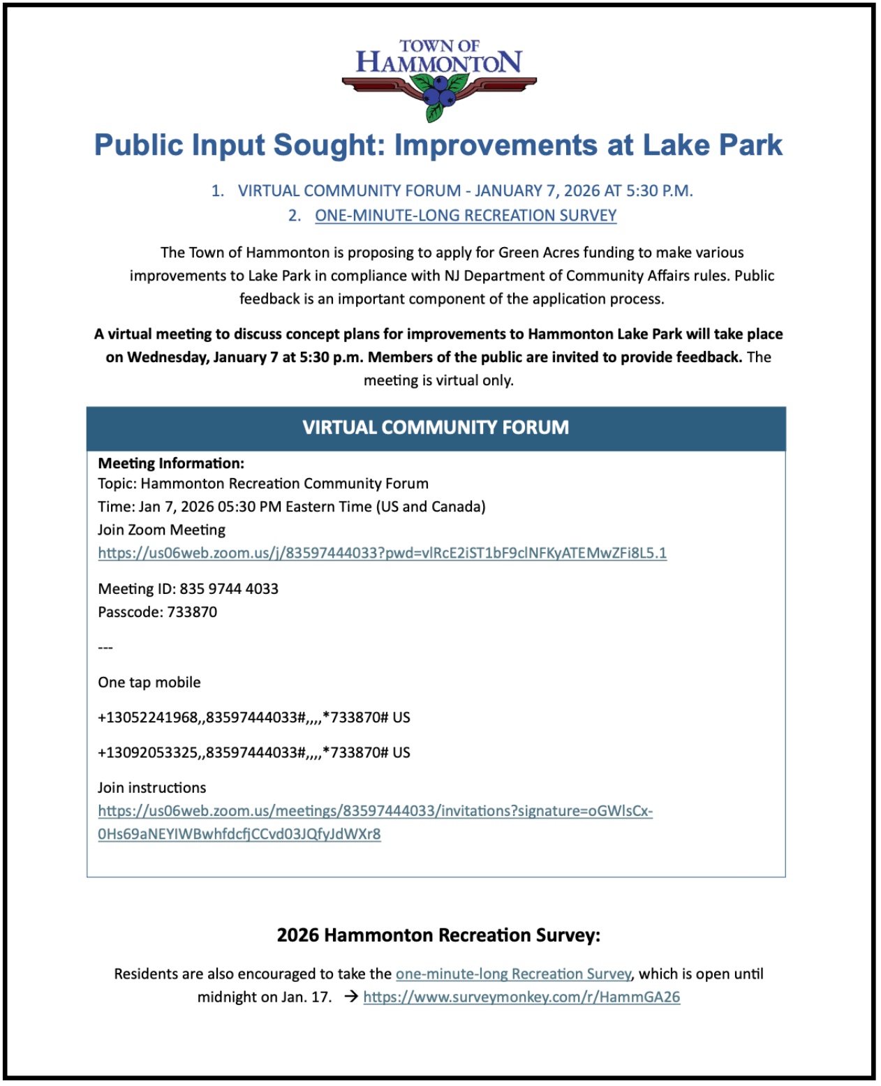 A virtual meeting to discuss concept plans for improvements to Hammonton Lake Park will take place on Wednesday, January 7 at 5:30 p.m. Members of the public are invited to provide feedback. The meeting is virtual only.