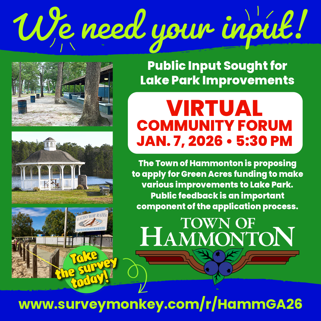 The Town of Hammonton is proposing to apply for Green Acres funding to make various improvements to Lake Park in compliance with NJ Department of Community Affairs rules. Public feedback is an important component of the application process.