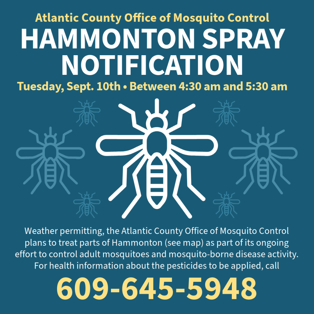 For health information about the pesticides to be applied, call the Atlantic County Office of Mosquito Control at 609-645-5948. Visit https://www.atlanticcountynj.gov/ for additional resources.